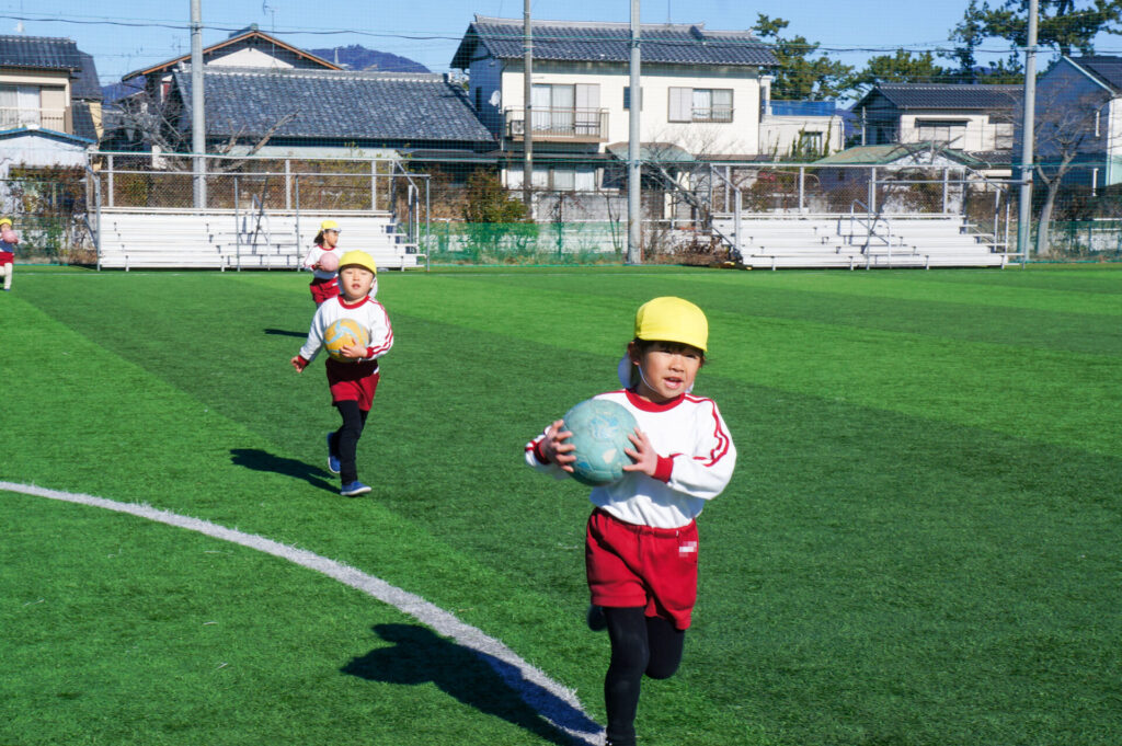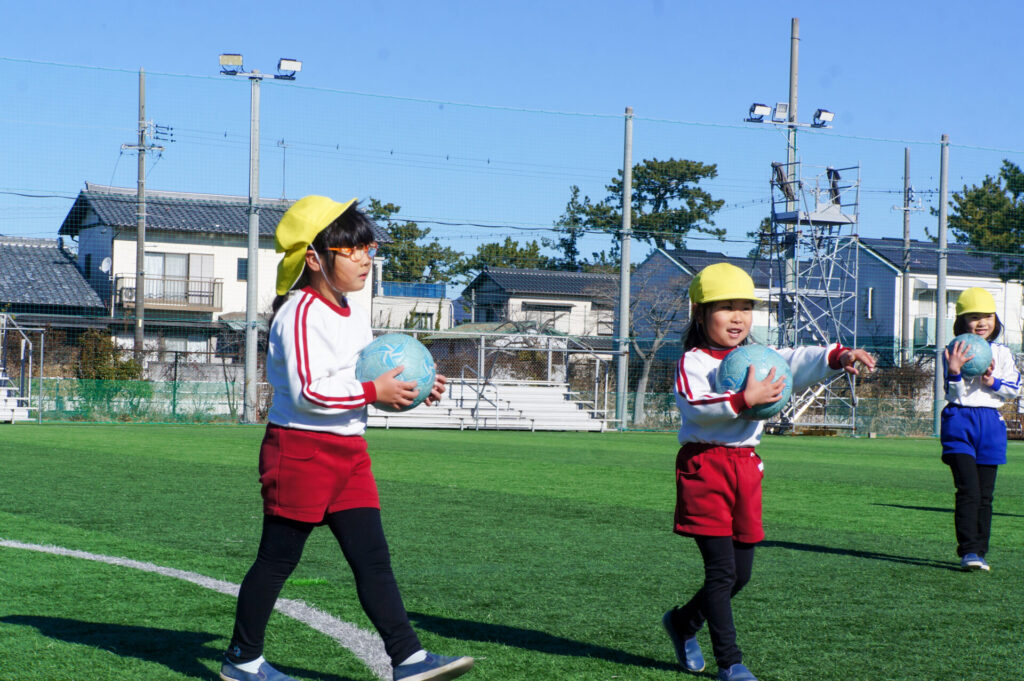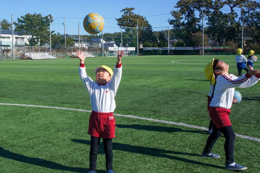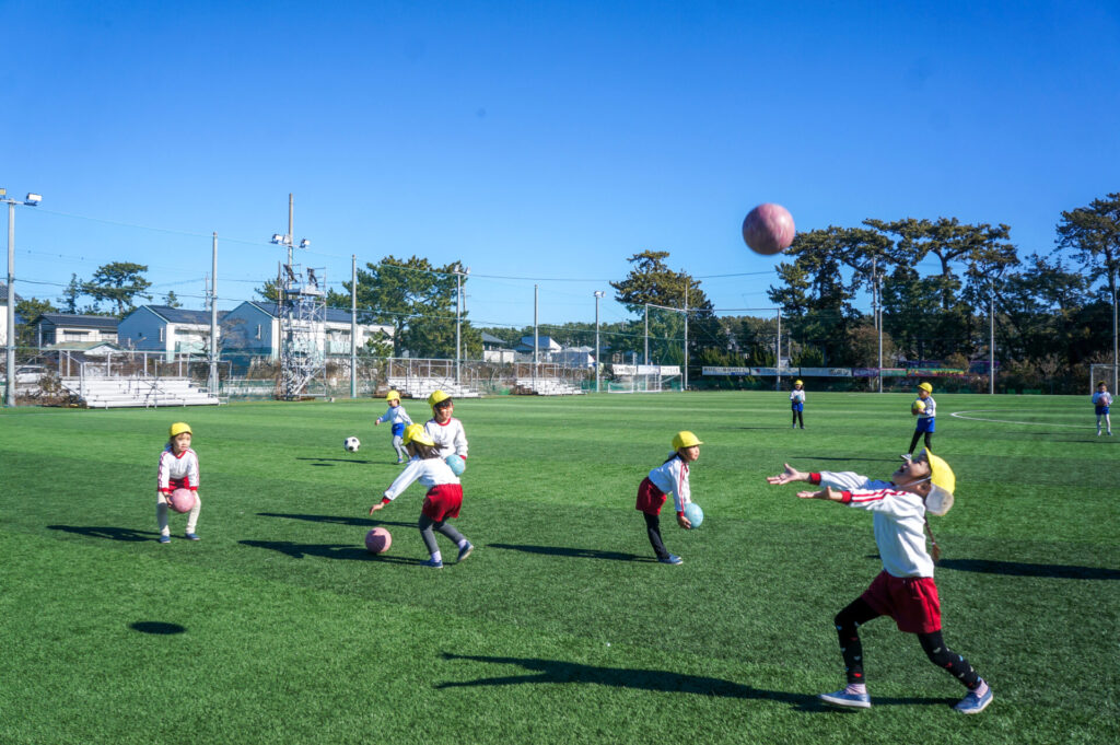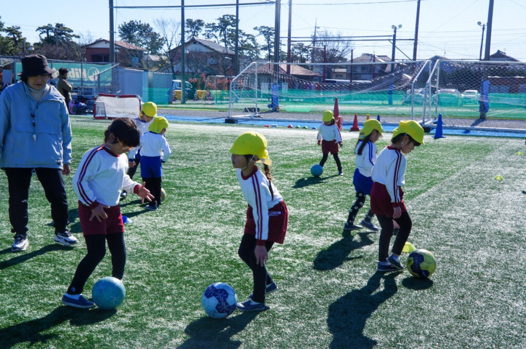 コロコロ転がるボールを足でコントロールするのは難しく、苦戦していましたが、「手を使ってはいけないこと」をしっかり理解していることが伝わってきました。