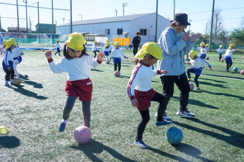 そして、1人1個、ボールを貸していただき、頭上に上げてボールキャッチをしたり、ドリブルを教えていただきました。笛の合図で「ボールを止める(タップ)」ことも繰り返しで機敏になりました。