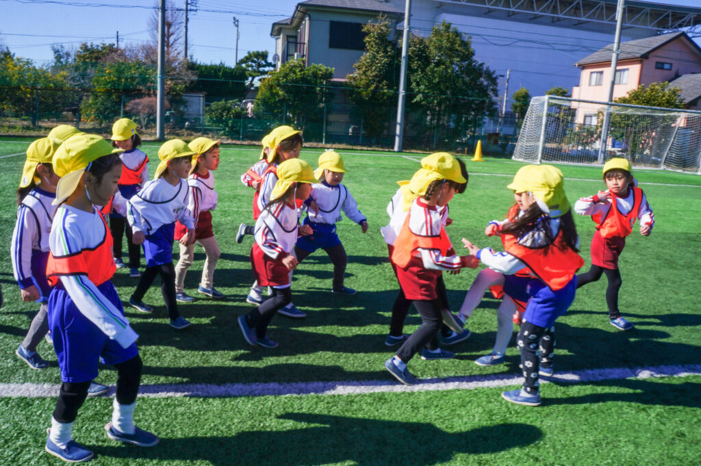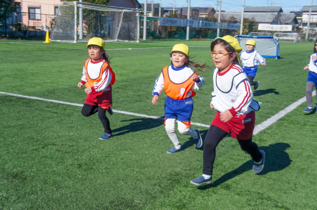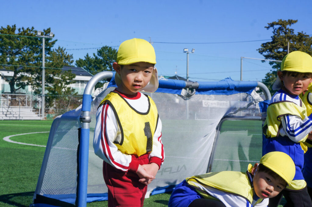 さぁ、最後はミニゲーム!1個のボールに向かって、走り回りました。ゴール前に待つ園児へ上手くパスがつながるかと思いきや、そこをカットしたり、「1点」が遠く、それだけ、内容の濃いミニゲームになりました。
