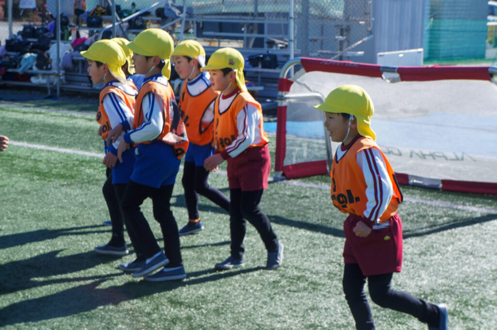 今日は「ボールがラインアウトしたら、新しいボールを投入する」というルールの下、行いました。新しいボールはどこに入ってくるか分かりません。でもそれだけ、周りを見て走り回り、終了まであきらめずにボールを追いかけることができました。