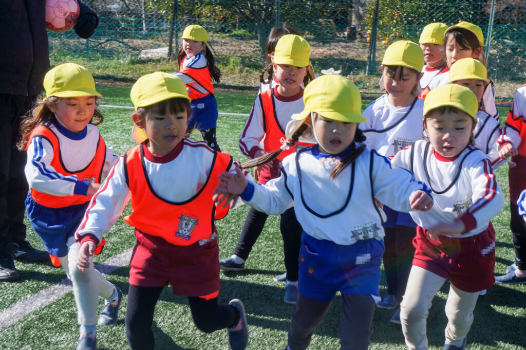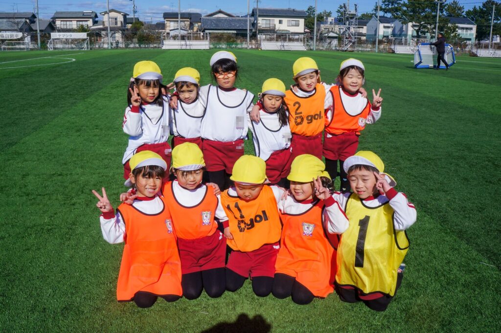 この度、年長つき組が「藤枝MYFC サッカー教室」へ参加しました。身支度を整えて、園近くの「藤枝MYFC サッカーグランド(いちまるグランド)」へ出発しました。