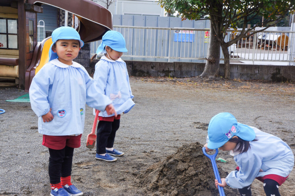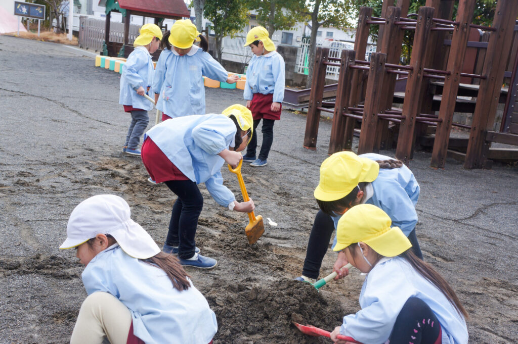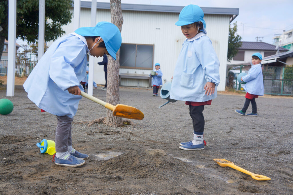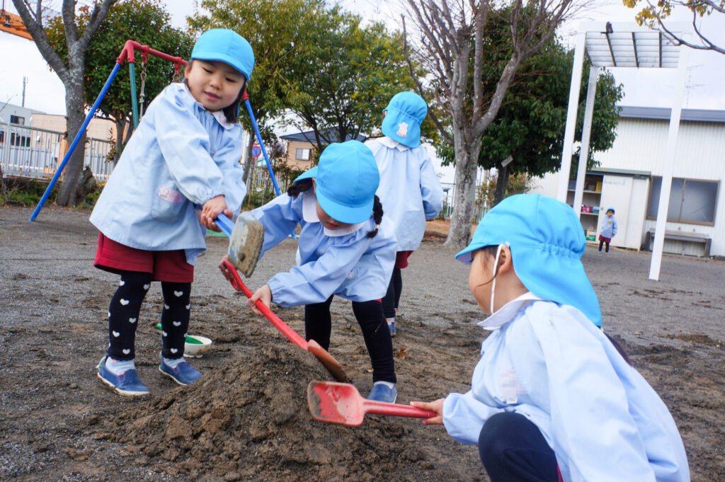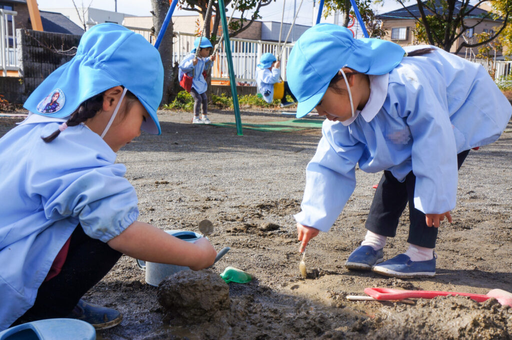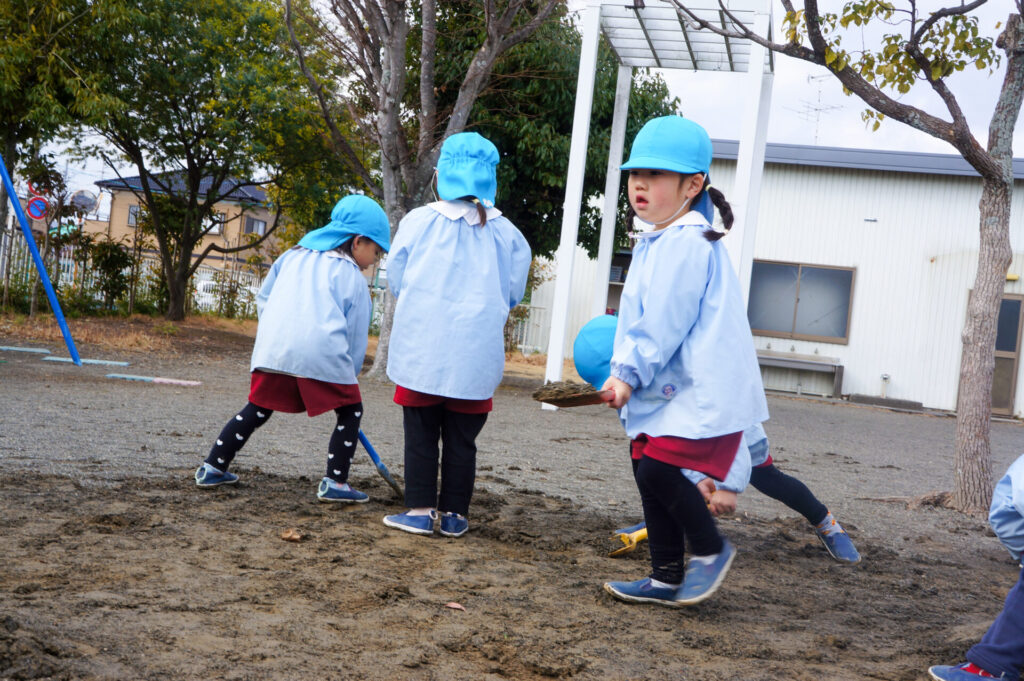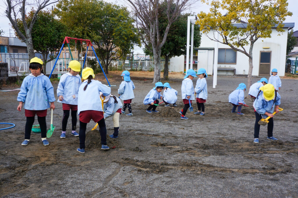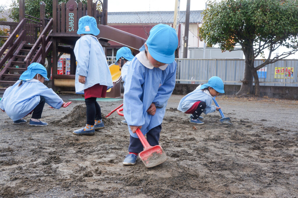 園での様子 砂遊び sumiredaihp 2026年2月12日 今年になって雨が降ることも少なく、園庭の砂も乾燥しており「さら粉」作りに夢中だったすみれっ子。 今日は、昨日の雨で園庭が湿っており「いつもと砂が違う感じがする」と言って、シャベルを持ち出し園庭を掘って遊んでいました。山を作ったり、シャベルで線を引き道にしたり、いつもと違う感触に子どもたちも喜んでいました。 だんだん遊びを進めていくと、年長つき組はおだんご作りに発展していきました。おだんご作りには「さら粉」が必需品です!「さら粉」を求めてピョンちゃんハウスに移動をして、おだんごを作る人、「さら粉」を作る人、おだんごに「さら粉」をまぶす人に役割分担をして遊んでいました。 年少ゆり組は、水を使って遊び始めました。作った山に水をかけて感触を楽しんだり、お椀に泥をいれてごっこ遊びをしたり、それぞれが遊びを楽しんでいました。 今日は、子どもたちが熱中して遊ぶ姿もあり、戸外遊びの時間も延長して遊びこみました。最後は、園庭整備をみんなでしました。久々の昨日の雨が、子どもたちの遊びを広げてくれました!