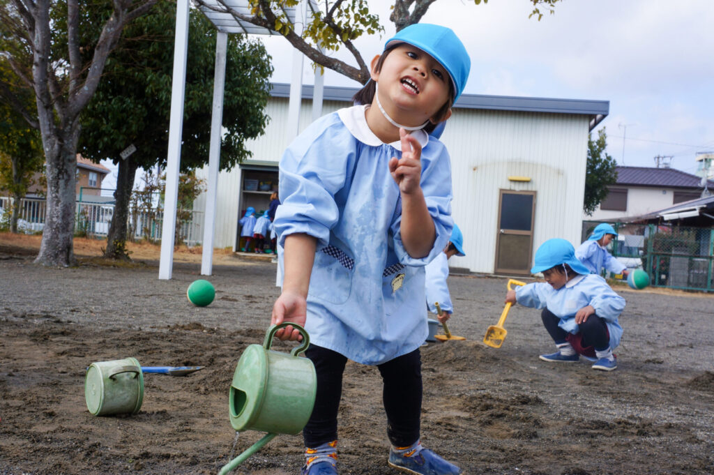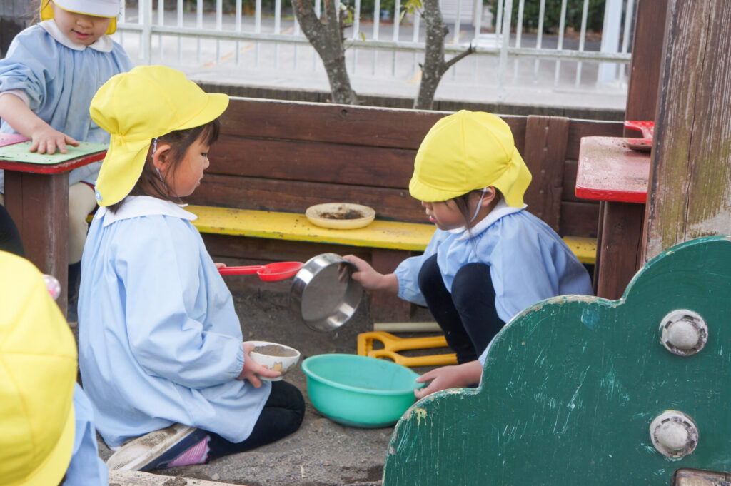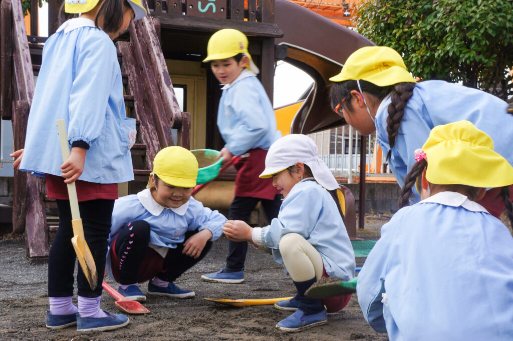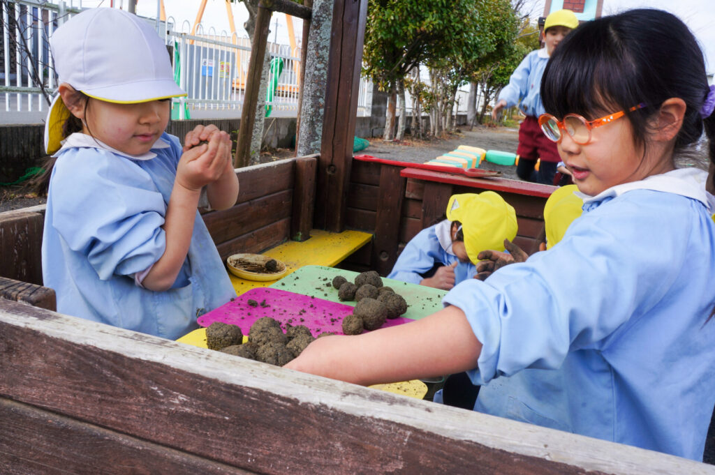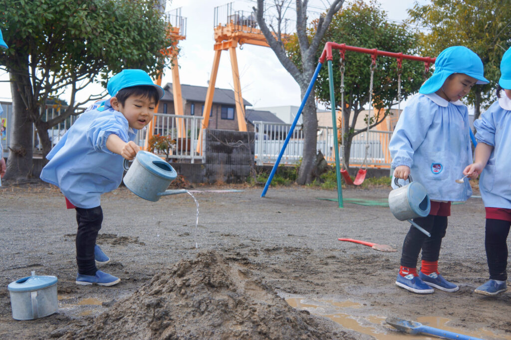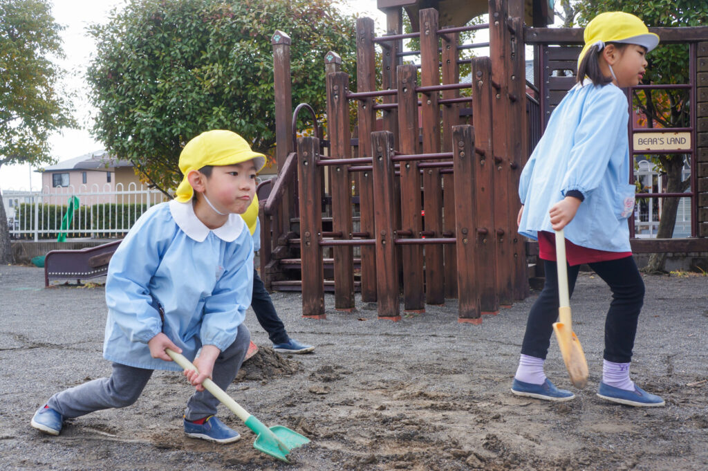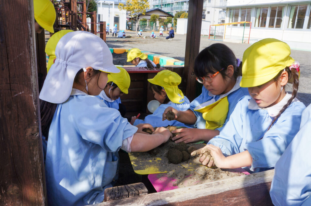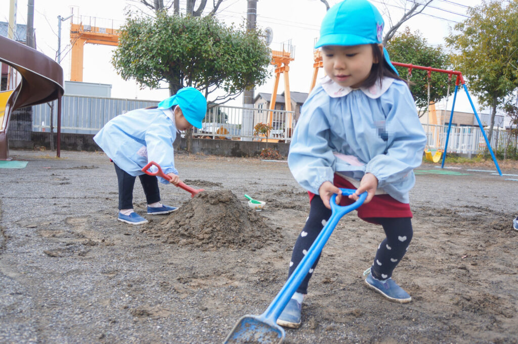 園での様子 砂遊び sumiredaihp 2026年2月12日 今年になって雨が降ることも少なく、園庭の砂も乾燥しており「さら粉」作りに夢中だったすみれっ子。 今日は、昨日の雨で園庭が湿っており「いつもと砂が違う感じがする」と言って、シャベルを持ち出し園庭を掘って遊んでいました。山を作ったり、シャベルで線を引き道にしたり、いつもと違う感触に子どもたちも喜んでいました。 だんだん遊びを進めていくと、年長つき組はおだんご作りに発展していきました。おだんご作りには「さら粉」が必需品です!「さら粉」を求めてピョンちゃんハウスに移動をして、おだんごを作る人、「さら粉」を作る人、おだんごに「さら粉」をまぶす人に役割分担をして遊んでいました。 年少ゆり組は、水を使って遊び始めました。作った山に水をかけて感触を楽しんだり、お椀に泥をいれてごっこ遊びをしたり、それぞれが遊びを楽しんでいました。 今日は、子どもたちが熱中して遊ぶ姿もあり、戸外遊びの時間も延長して遊びこみました。最後は、園庭整備をみんなでしました。久々の昨日の雨が、子どもたちの遊びを広げてくれました!