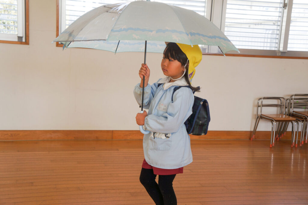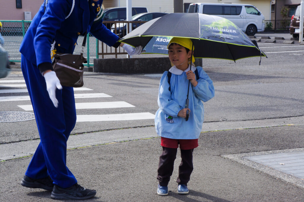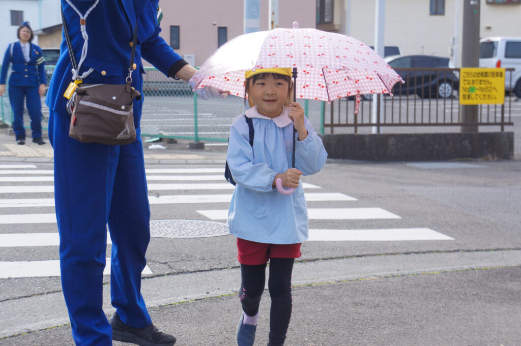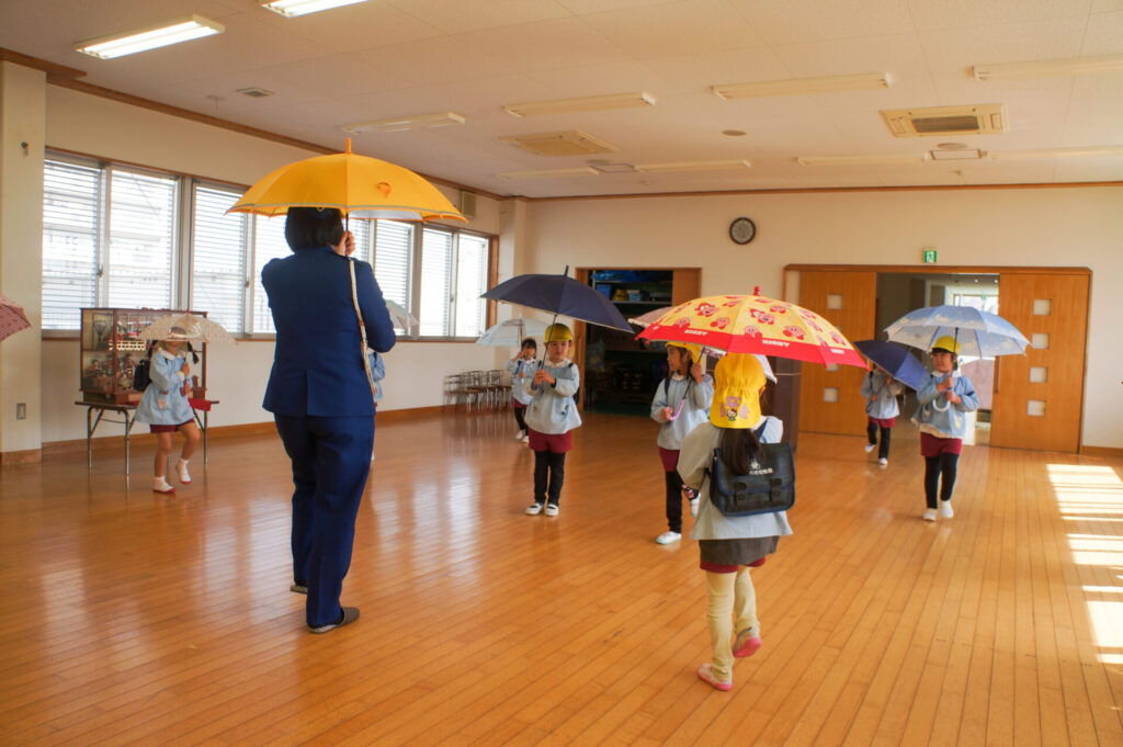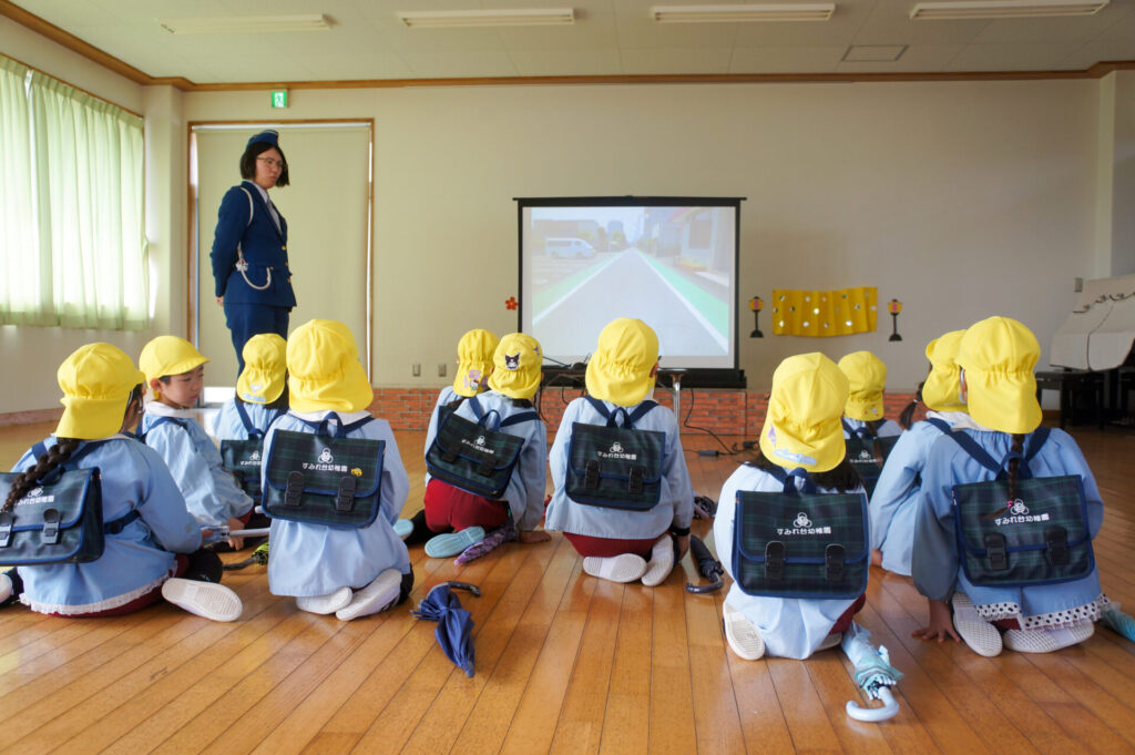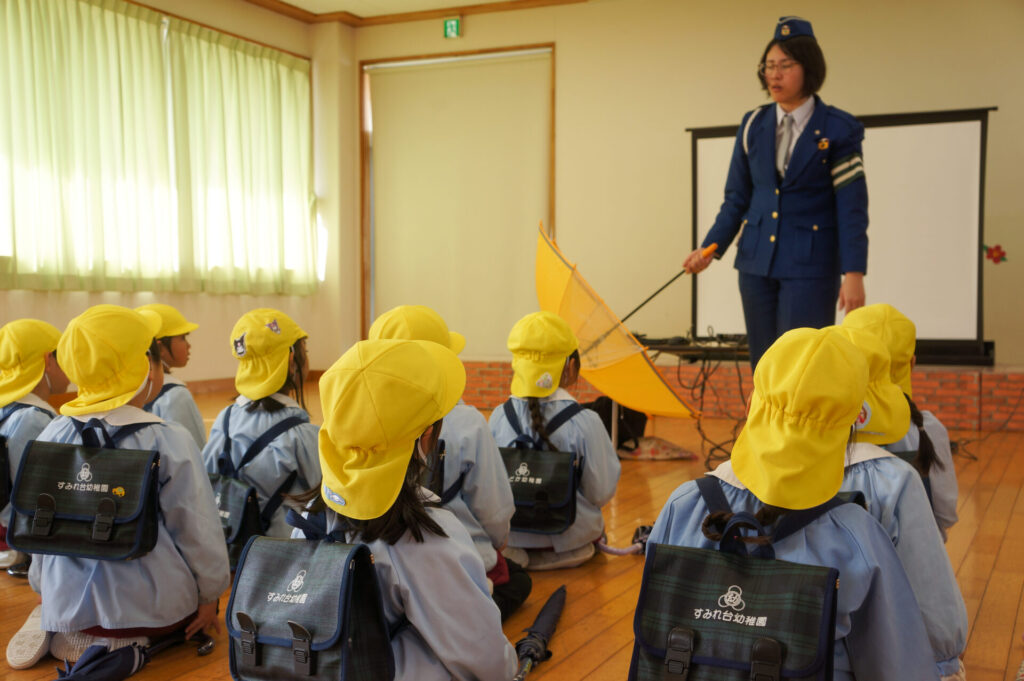 園での様子 就学前 交通安全教室(年長) sumiredaihp 2026年2月24日 年長つき組の園生活も残り少なくなってきました。今日は焼津警察署の交通指導員による「就学前の交通安全教室」を行いました。 4月からはそれぞれの小学校で新しい生活が始まります。今はおうちの方に送っていただいたり、スクールバスで登園していますが、小学校へは徒歩で通うことになります。 講話では信号の意味、道路を渡る時の約束の再確認をしました。今一度、横断歩道を渡る時は、運転手に自分の存在をアピールするためにも、しっかり上げるように、指導員より話がありました。そして、傘の扱いも一人ずつ行ってみました。傘を差す時は人がいないことを確認した上で開くことや雨水が濡れないためのしまい方などを教えていただき、実践しました。 最後は、交通講話のまとめとして、幼稚園前の道路を一人で歩きました。一人で実践すると途端に不安そうな表情をしていましたが、今まで教えていただいたことを思い返しながら安全に渡ることができました。 また、入学までにお子さまと一緒に通学路の確認をよろしくお願いいたします。子どもが歩くと何分位かかるのか、交差点や駐車場などの危険個所を確認する、ランドセルを背負って実際に歩きイメージを高めるなど、子どもたちが安全に登下校できるように通学路を何回か一緒に歩くことをお願いします。