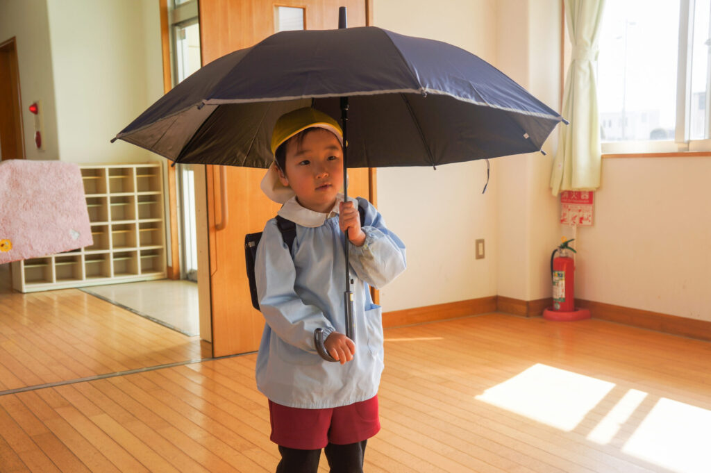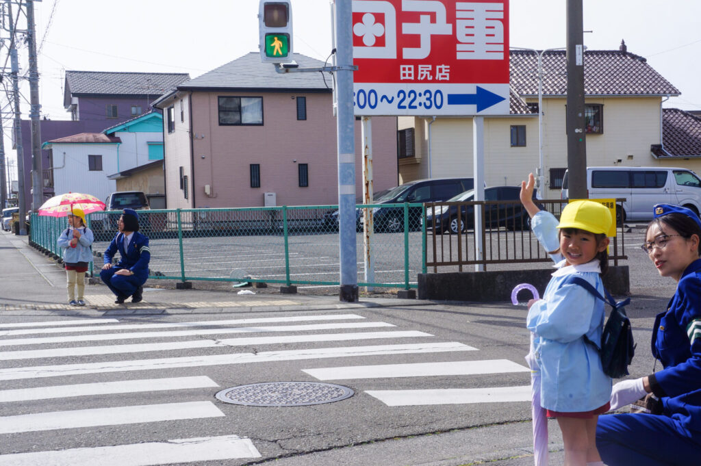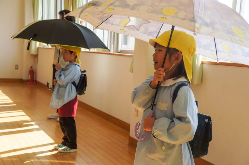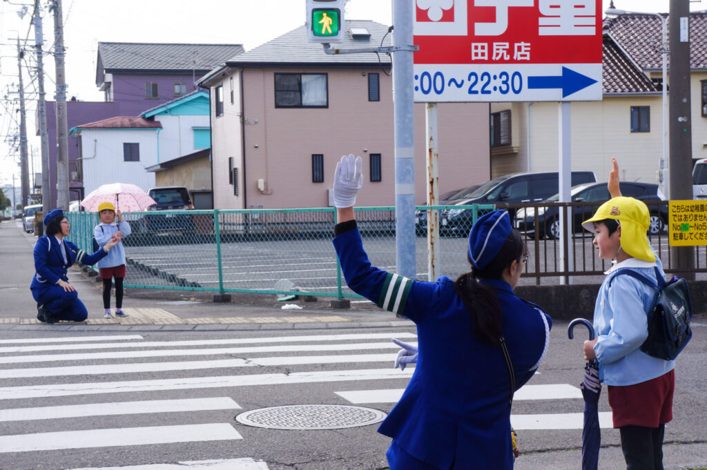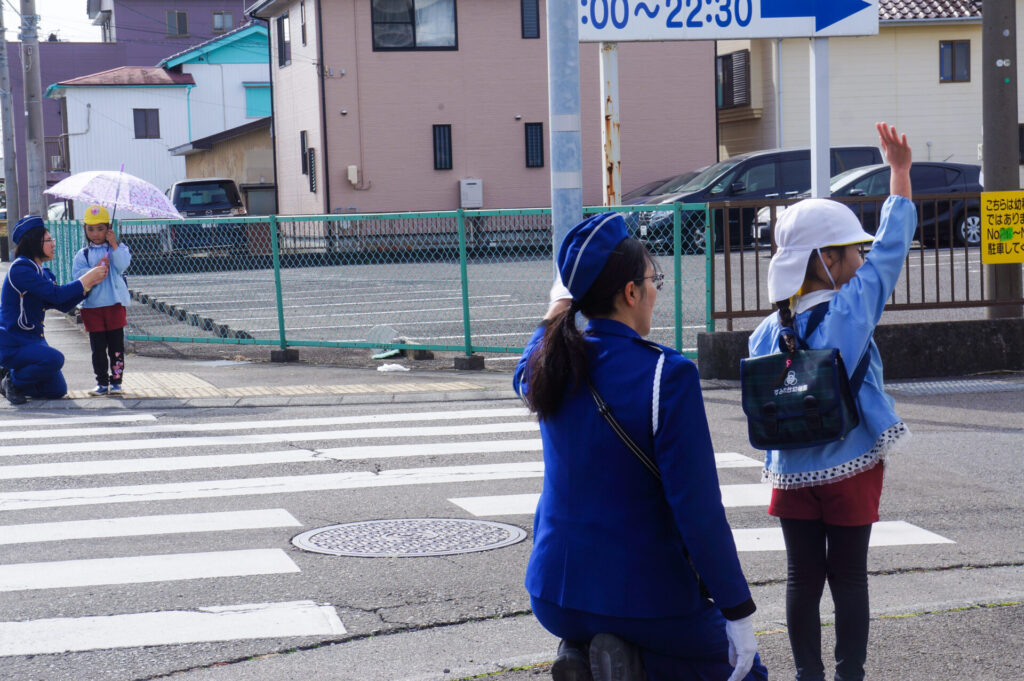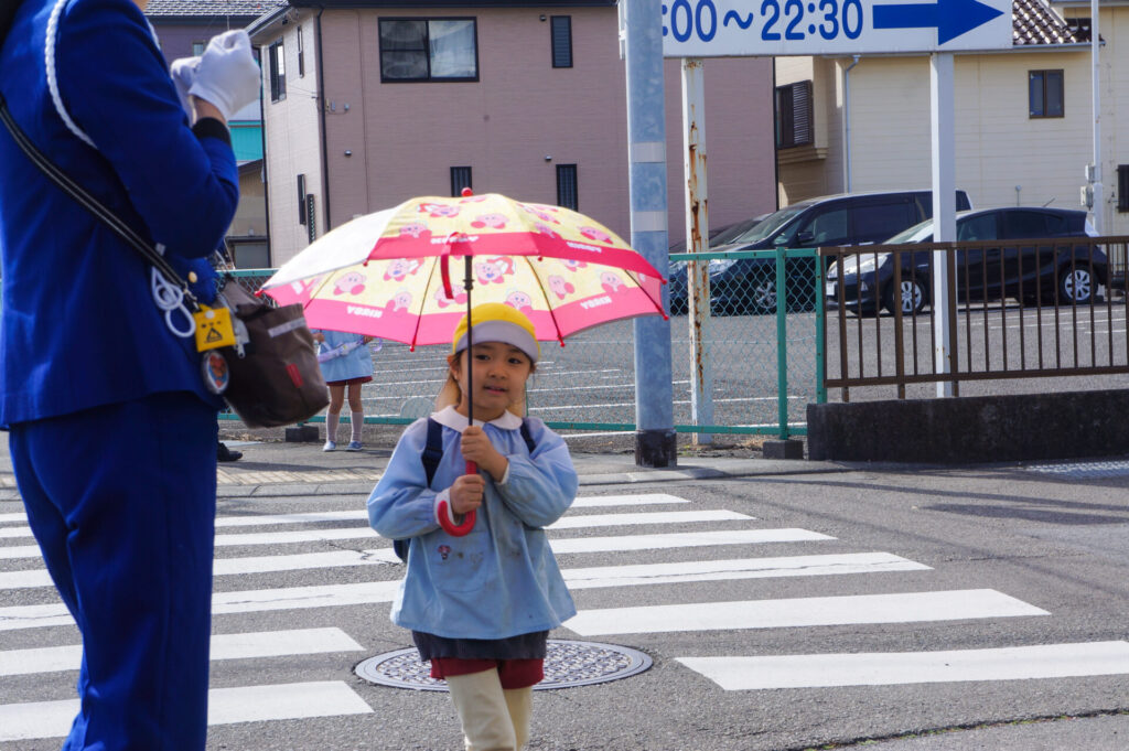 園での様子 就学前 交通安全教室(年長) sumiredaihp 2026年2月24日 年長つき組の園生活も残り少なくなってきました。今日は焼津警察署の交通指導員による「就学前の交通安全教室」を行いました。 4月からはそれぞれの小学校で新しい生活が始まります。今はおうちの方に送っていただいたり、スクールバスで登園していますが、小学校へは徒歩で通うことになります。 講話では信号の意味、道路を渡る時の約束の再確認をしました。今一度、横断歩道を渡る時は、運転手に自分の存在をアピールするためにも、しっかり上げるように、指導員より話がありました。そして、傘の扱いも一人ずつ行ってみました。傘を差す時は人がいないことを確認した上で開くことや雨水が濡れないためのしまい方などを教えていただき、実践しました。 最後は、交通講話のまとめとして、幼稚園前の道路を一人で歩きました。一人で実践すると途端に不安そうな表情をしていましたが、今まで教えていただいたことを思い返しながら安全に渡ることができました。 また、入学までにお子さまと一緒に通学路の確認をよろしくお願いいたします。子どもが歩くと何分位かかるのか、交差点や駐車場などの危険個所を確認する、ランドセルを背負って実際に歩きイメージを高めるなど、子どもたちが安全に登下校できるように通学路を何回か一緒に歩くことをお願いします。