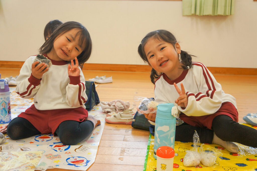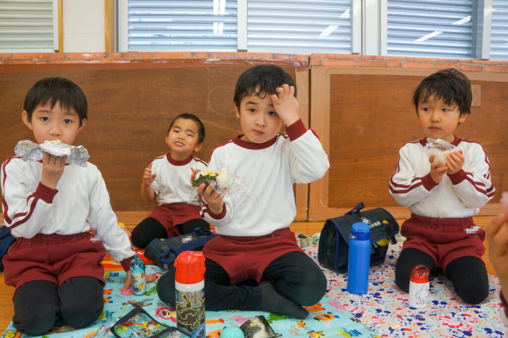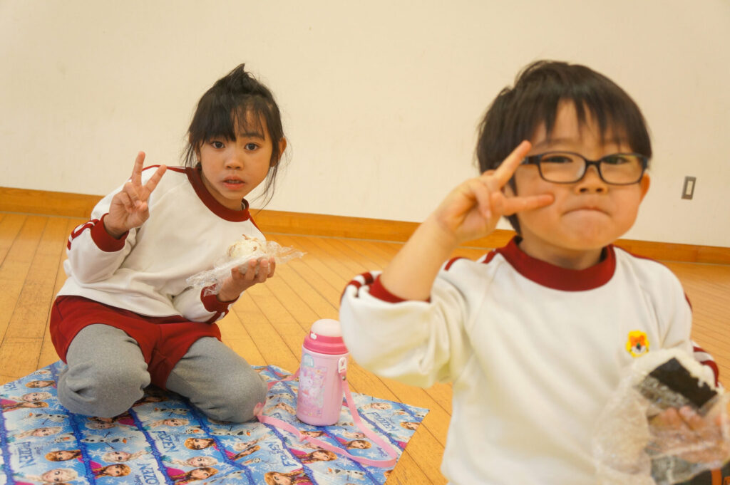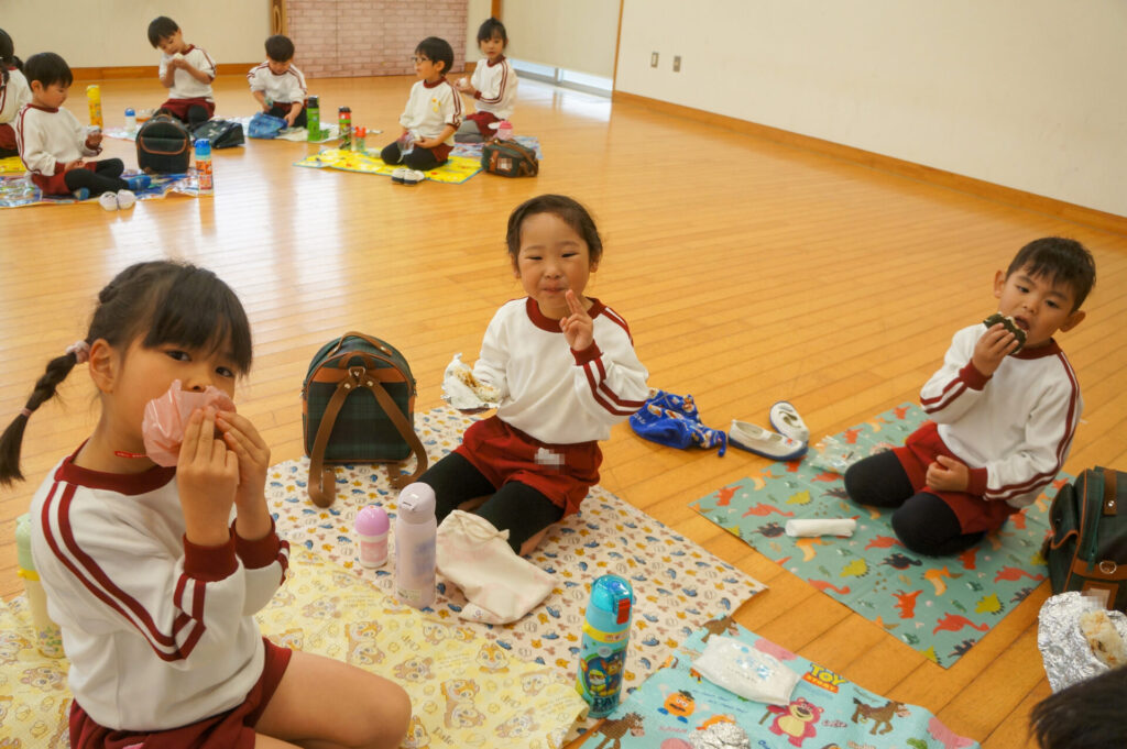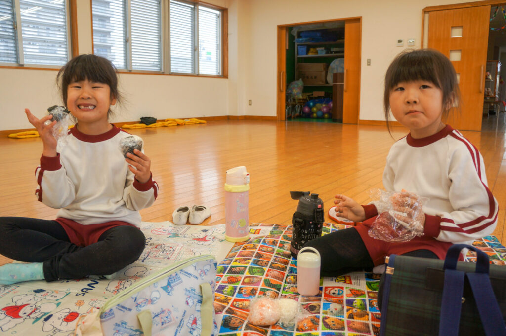 まずは、みんなでドッジボールです。ボールを素早く拾う、敵に向かって投げる、ボールに当たらないように逃たりキャッチする、ひとつの遊びの中でも色々な要素があり子どもたちも必死になって遊んでいました。汗もいっぱいかきお腹もすき、楽しみにしていたおにぎりの時間です。シートを敷いて「一緒に食べよう」と誘い合い、みんなでおにぎりを食べ笑顔もいっぱいでした。
