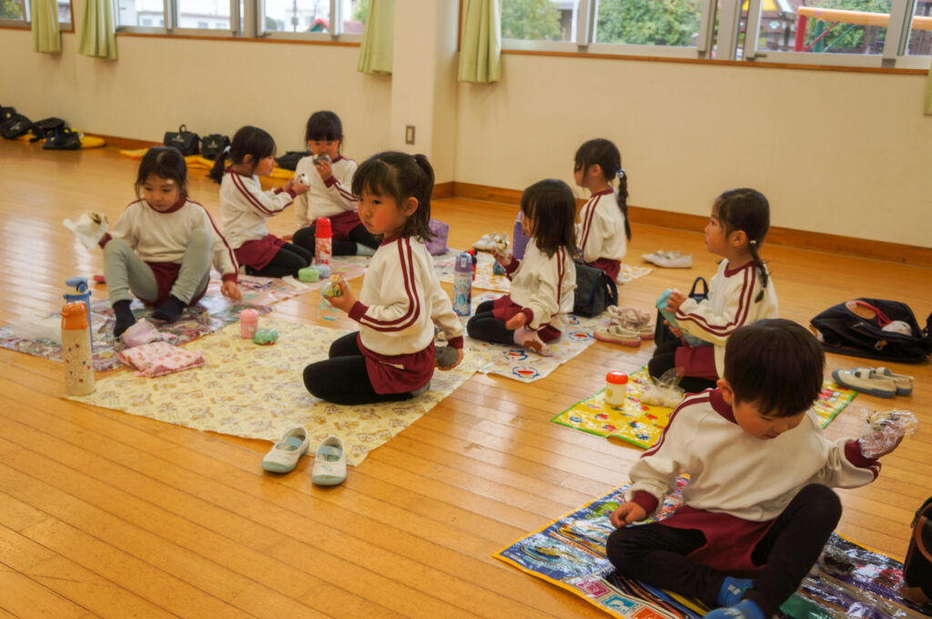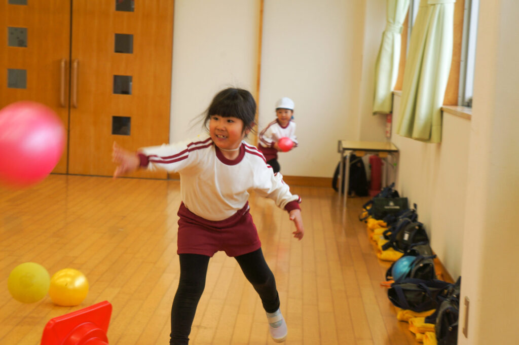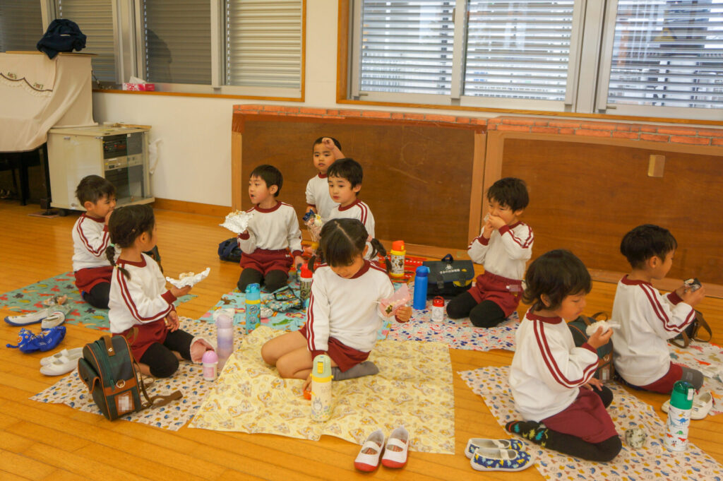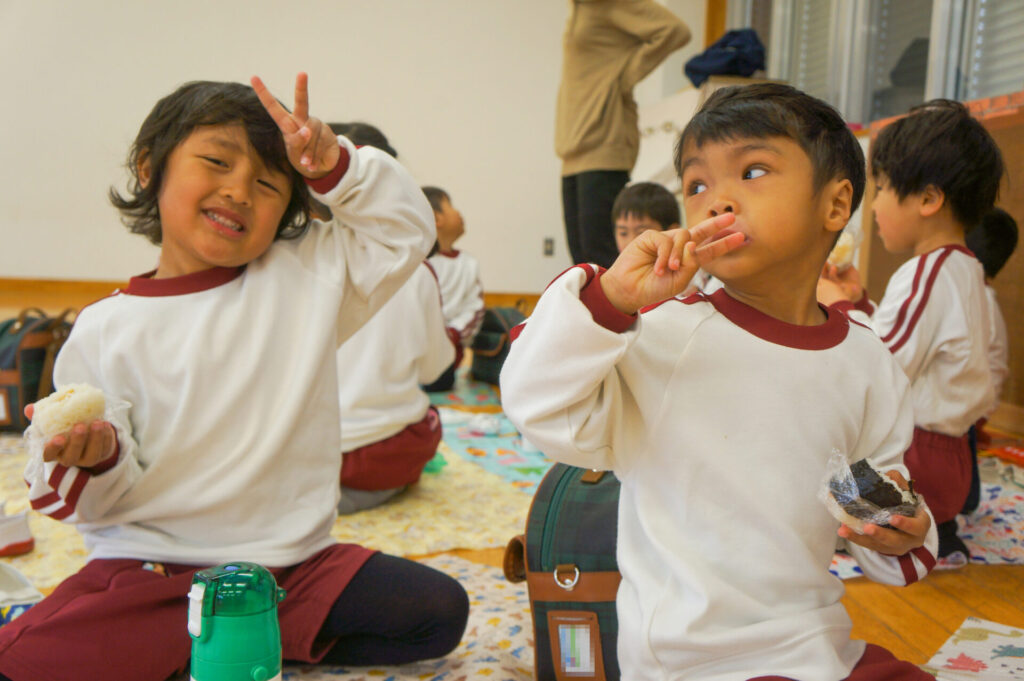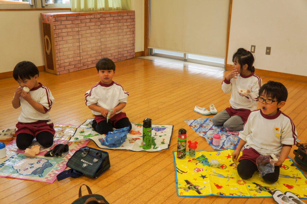 まずは、みんなでドッジボールです。ボールを素早く拾う、敵に向かって投げる、ボールに当たらないように逃たりキャッチする、ひとつの遊びの中でも色々な要素があり子どもたちも必死になって遊んでいました。汗もいっぱいかきお腹もすき、楽しみにしていたおにぎりの時間です。シートを敷いて「一緒に食べよう」と誘い合い、みんなでおにぎりを食べ笑顔もいっぱいでした。
