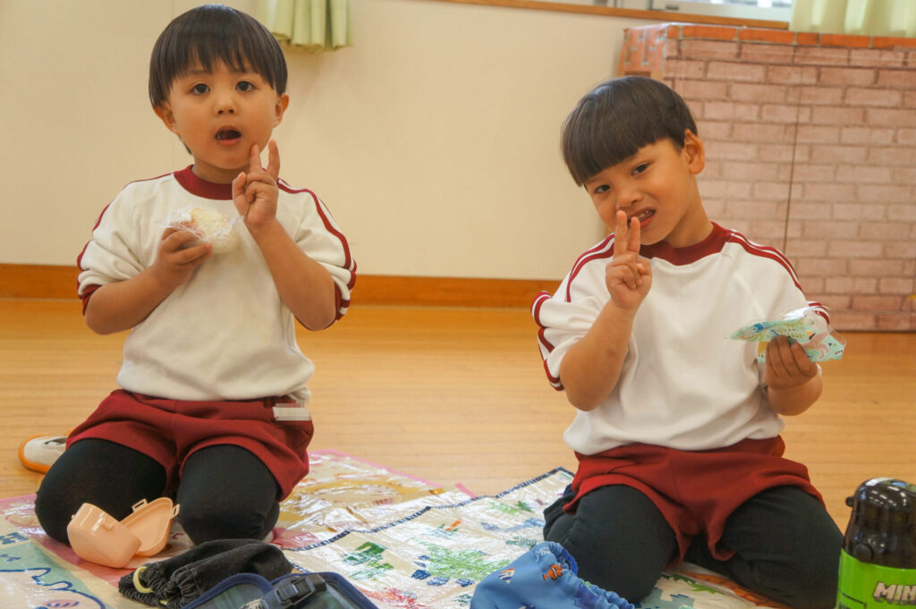 今日は、松原公園へのハイクの予定が雨!がっかりした気持ちもありますが、園内で遠足ごっことお楽しみ会をして楽しみました。