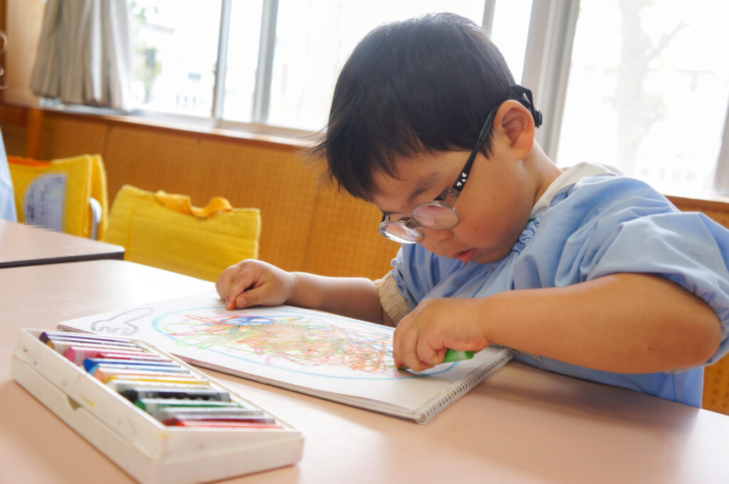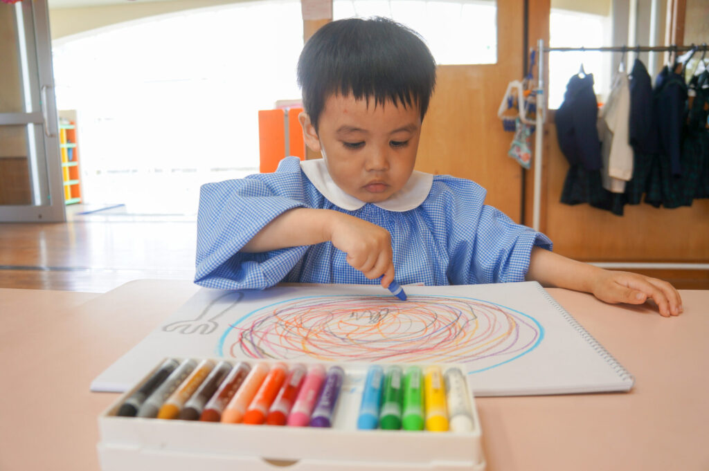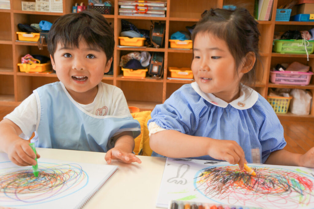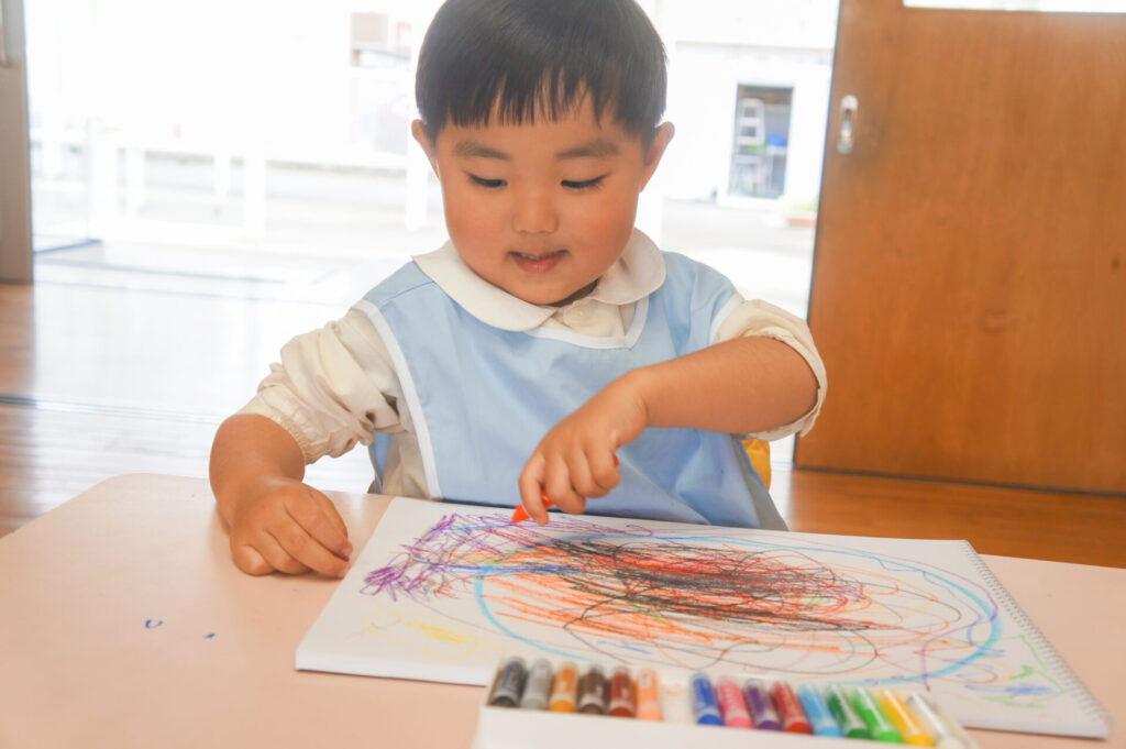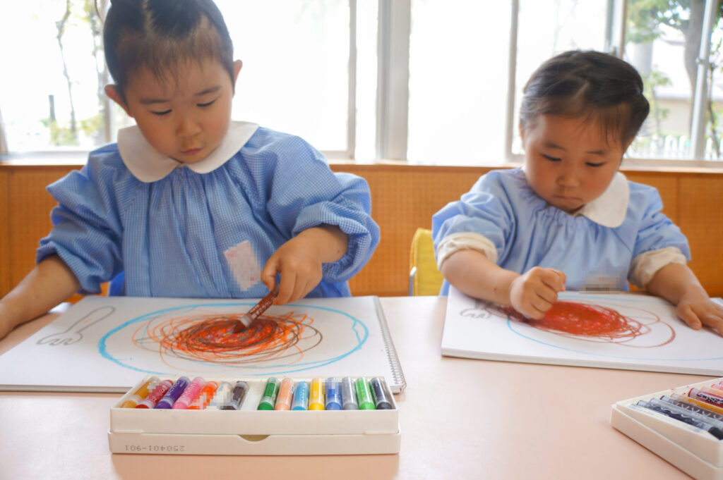 園での様子 クレヨン遊び(年少) sumiredaihp 2026年4月27日 園での生活にも少しずつ慣れ、子どもたちの笑顔もたくさん見られるようになりました。友だちや先生の名前を覚えた子も増え、呼び合う様子も見られます。大好きなおうちの方のことを思い出し涙を浮かべる子もいますが、日々集団生活の中で成長をしているゆり組の子どもたちです。 今日は、クレヨンでぐるぐるスパゲティーを描きました。「赤にする」「次は黄色」と色を口ずさみながら楽しく描きました。 明日は、子どもたちが楽しみにしている親子遠足です。